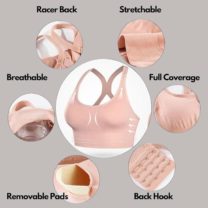- Full coverage sports bra with Back hook Closure. 4 Line of Hook for size adjustment. Broad hem for better support and maximum comfort