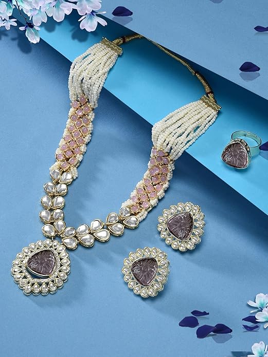 Pink Purple Stones Embellished Kundan Necklace Earring & Ring Set For Women