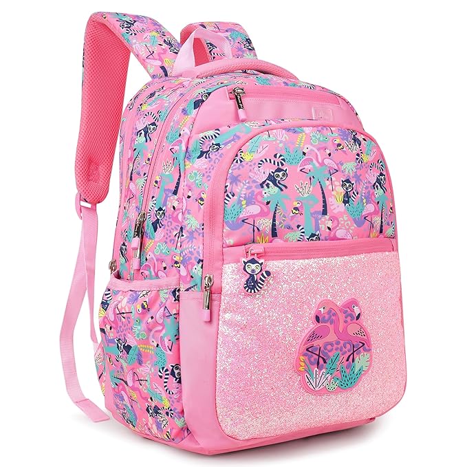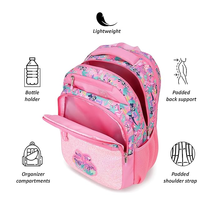 • 1. Attractive Design: Glittery purple front pocket with a "Beauty Girl" zipper, and a colorful print of pink flamingos, green palm trees, and black and white lemurs.
