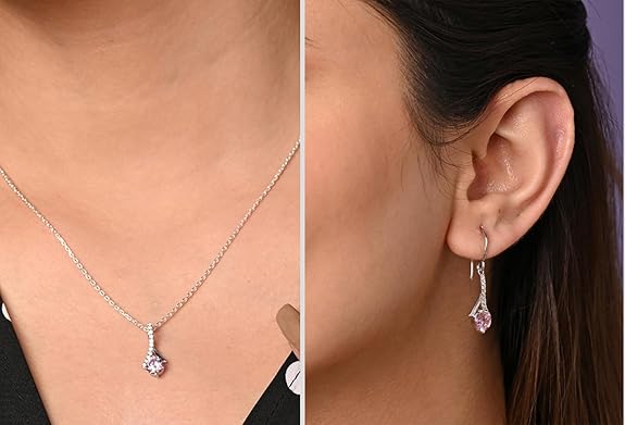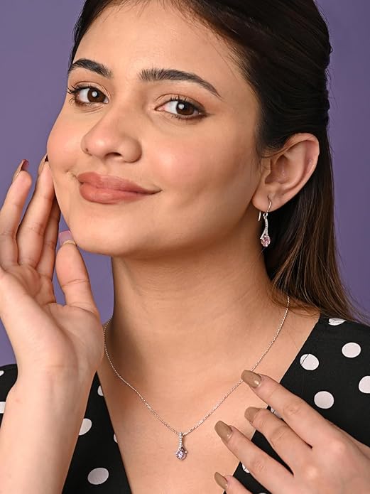 Silver Pink Solitaire Pendant Earring Chain Jewellery Set