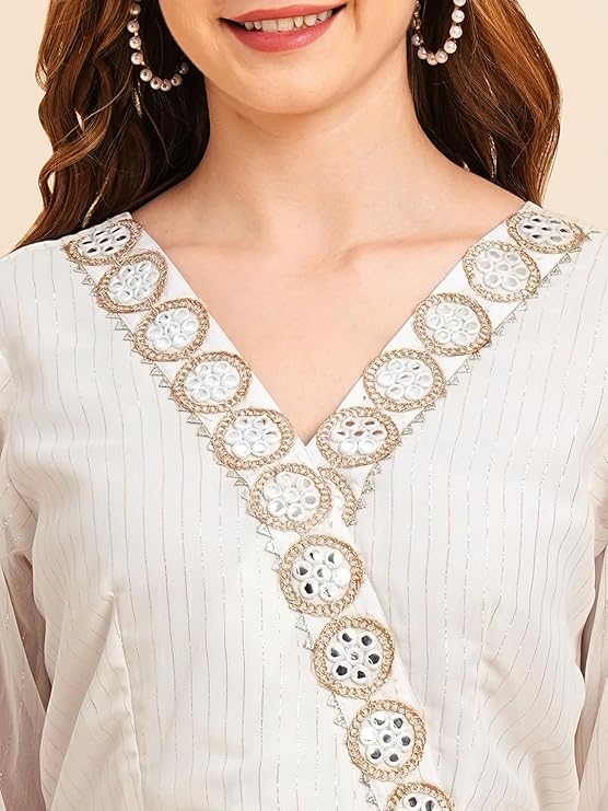 - High-quality fabric ensures comfort and impeccable drape. Intricate embellishments and mirror work add opulence and grandeur
