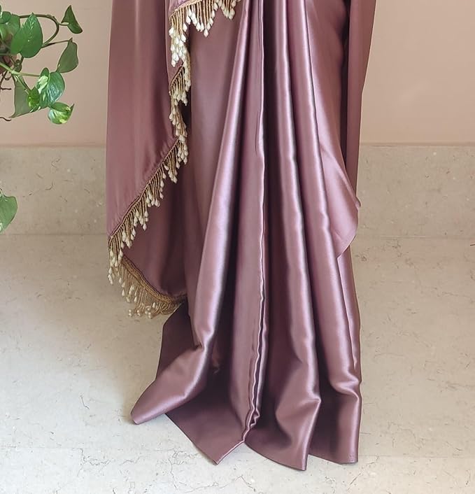 Women's Ready to Wear Rose Gold Satin Silk 1 Minute Pre Pleated Saree with Unstitched Rose Gold