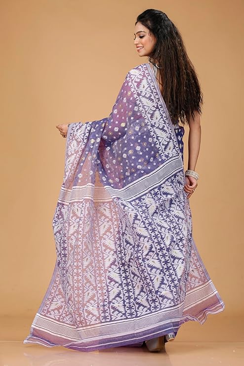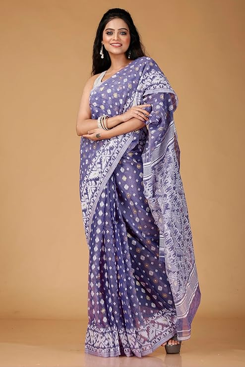 • About Jamdani Saree: Jamdani sarees are made of high quality cotton muslin, which is very thin and soft, making the saree very light and airy. Jamdani sarees are characterised by eye-catching ornamental motifs woven onto the fabric. These intricate motifs in thicker thread seem to float on the surface of the ultra-fine fabric.