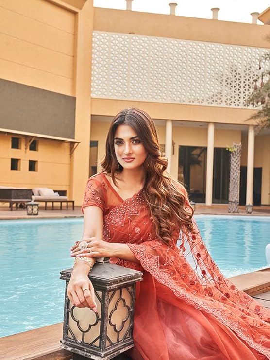 - Fabric Details : Saree : Net | Color : Orange | 100% Synthetic | Fit Type : Regular