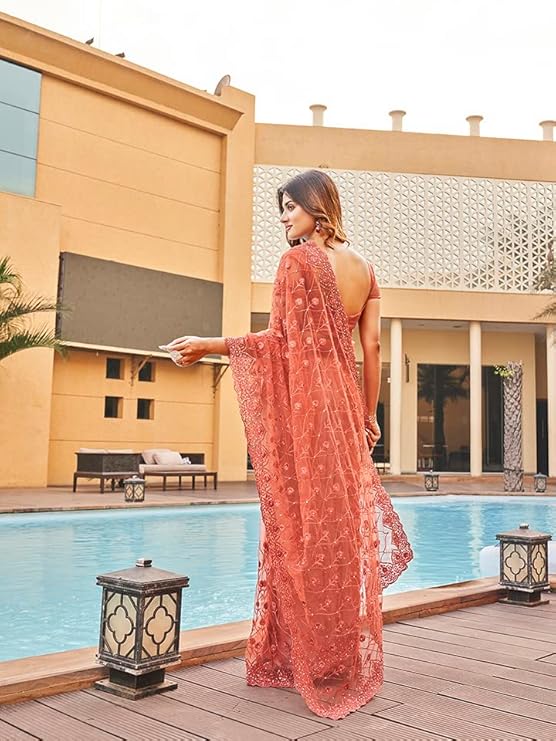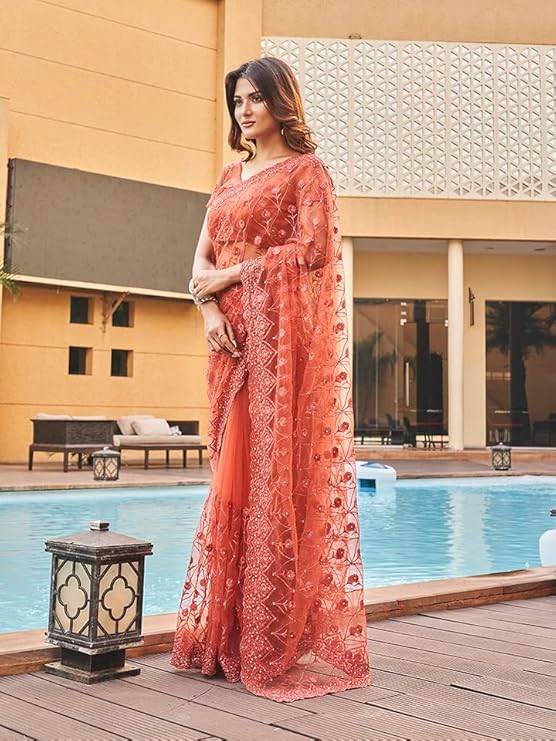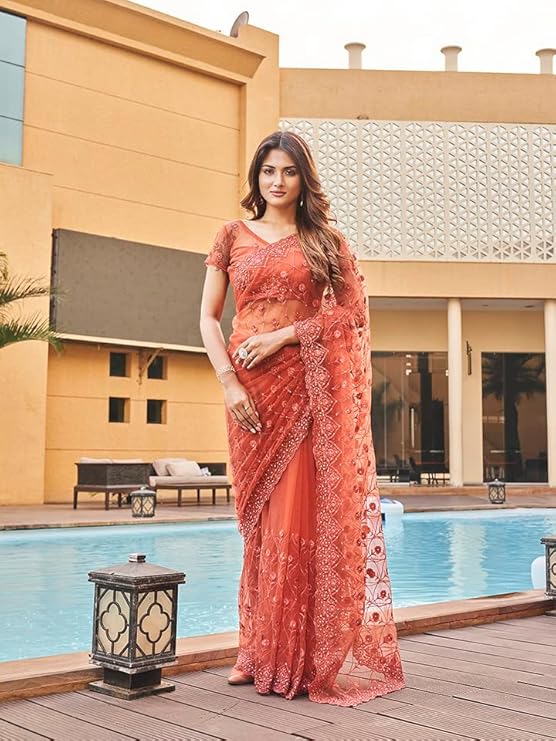 Women Net Saree ll Women Embroidered saree ll Women Orange saree ll Un-stitched blouse saree