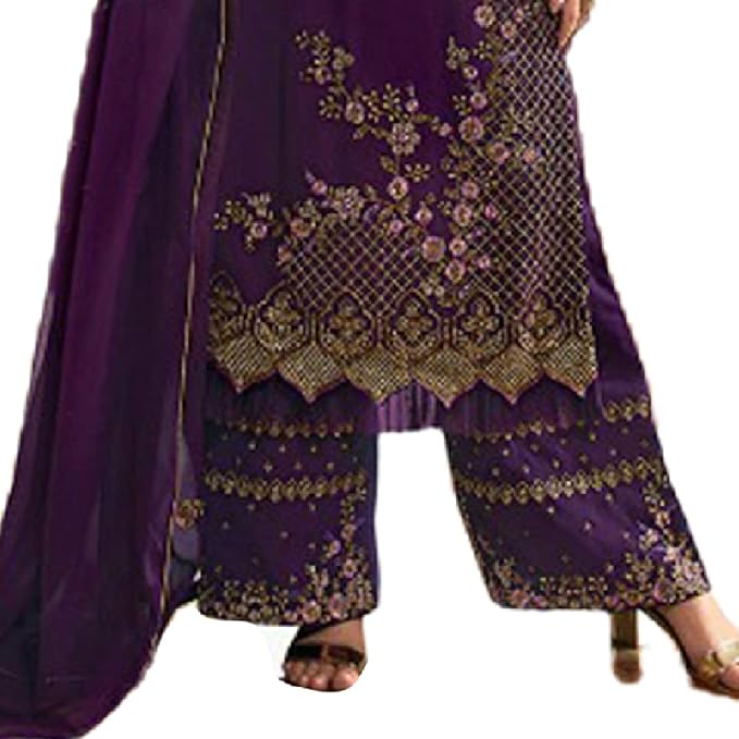 Women's Faux Georgette Semi Stitched Top With Unstitched Santoon Bottom and Net Dupatta Embroidered Straight Kurta Dress Material (Kurta Palazzo Set)