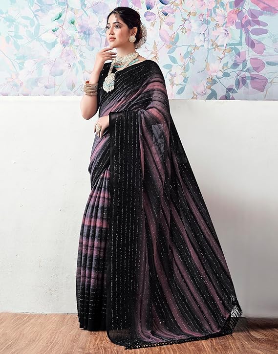 - Saree Fabric: Georgette | Blouse Fabric: Poly Cotton | Work:: Saree: Printed Zari Stripe | Blouse: Dyed, Sequence Embroidery